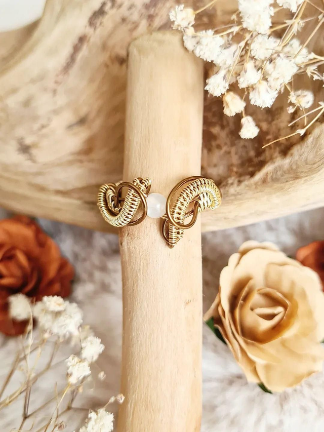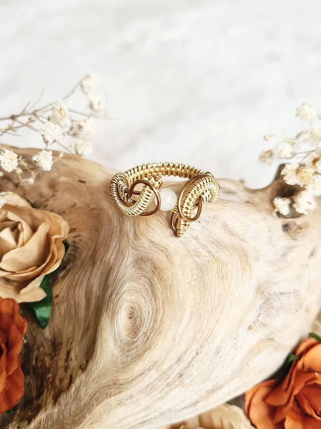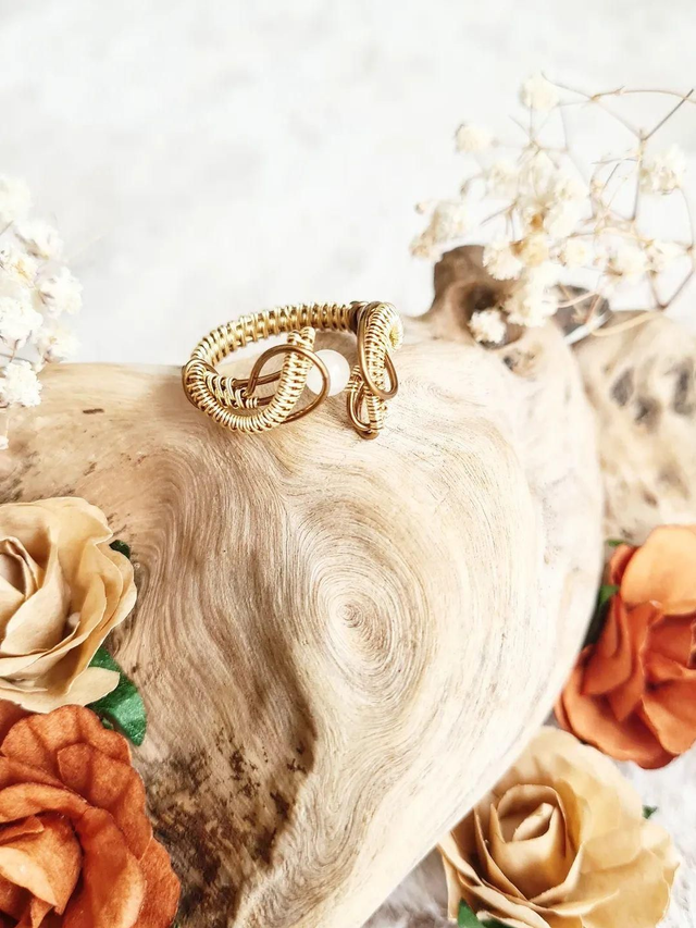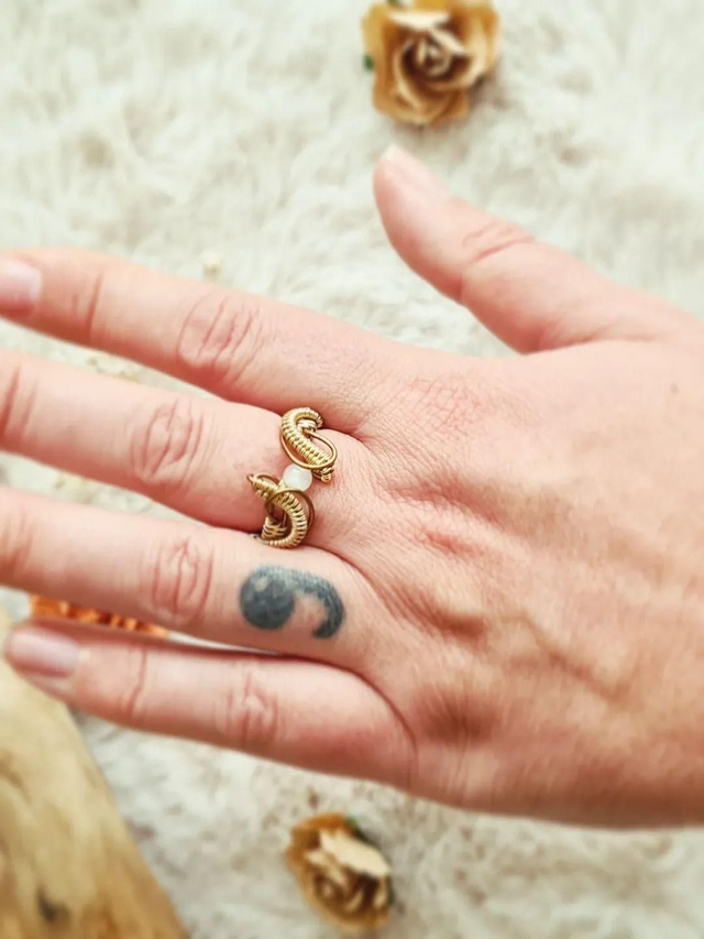 Bague artisanale façonnée à la main avec la technique du wire wrapping. Son fil doré s'enroule en spirales protectrices.
