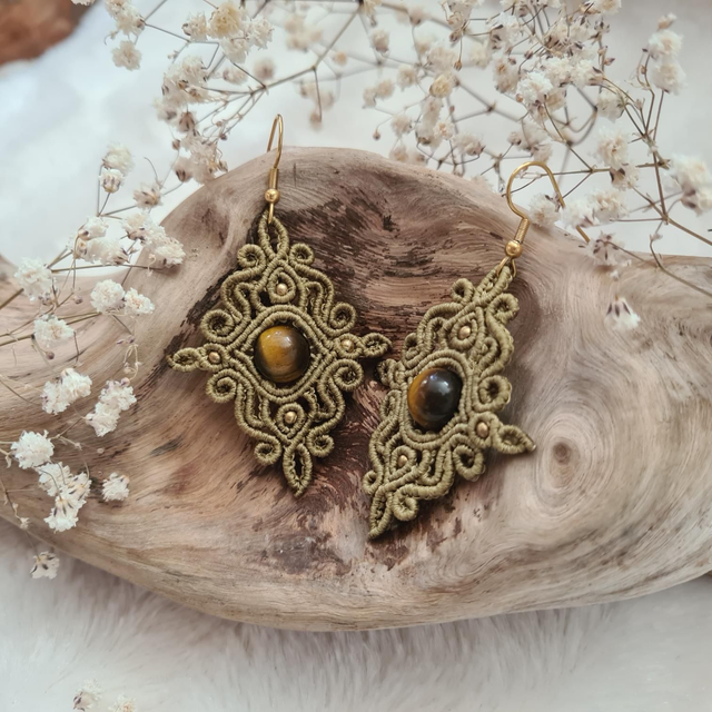 Elles sont entièrement personnalisable, ici le bijou est fait avec un fil vert olive, des perles dorées et une perle œil de tigre. Vous pouvez choisir la couleur du fil ainsi que la perle de pierre naturelle.