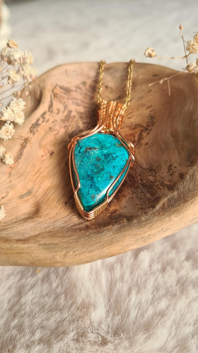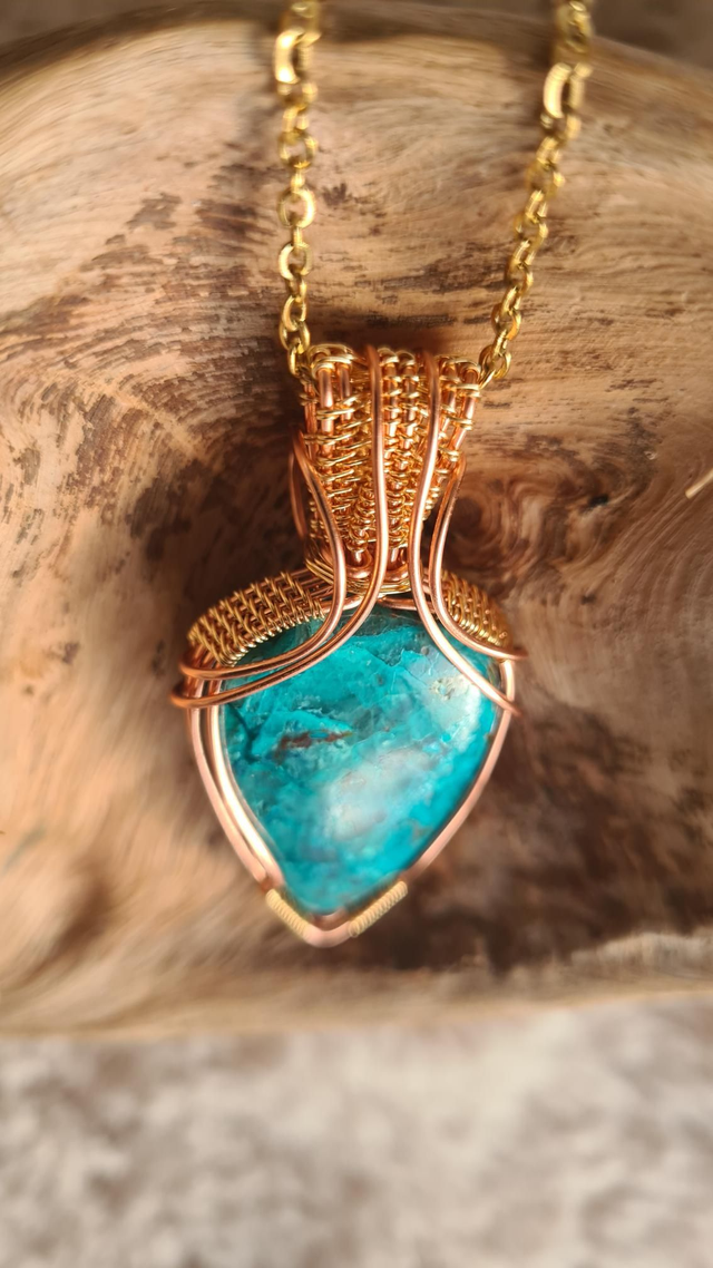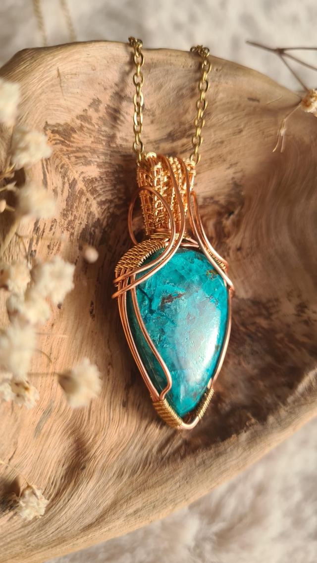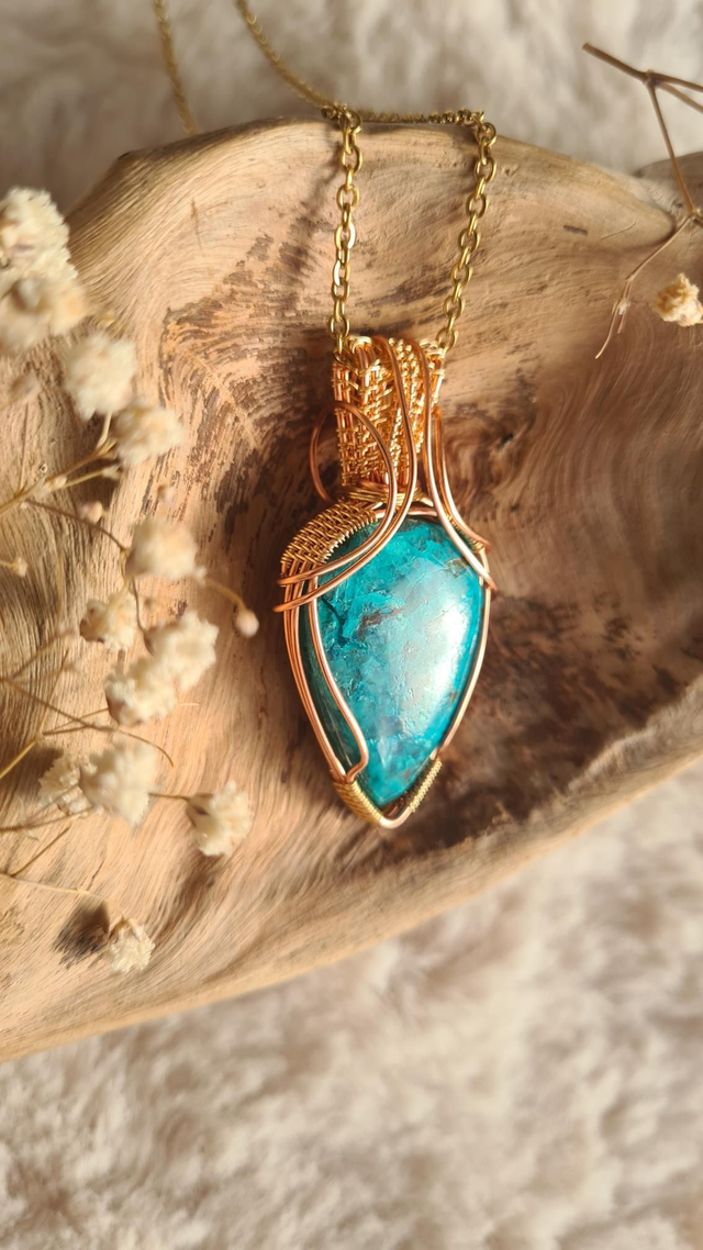 Fabriqué à la main dans mon atelier, ce collier elfique en chrysocolle naturelle est une pièce unique, entièrement réalisée en wire wrapping avec du fil de cuivre et des touches dorées.