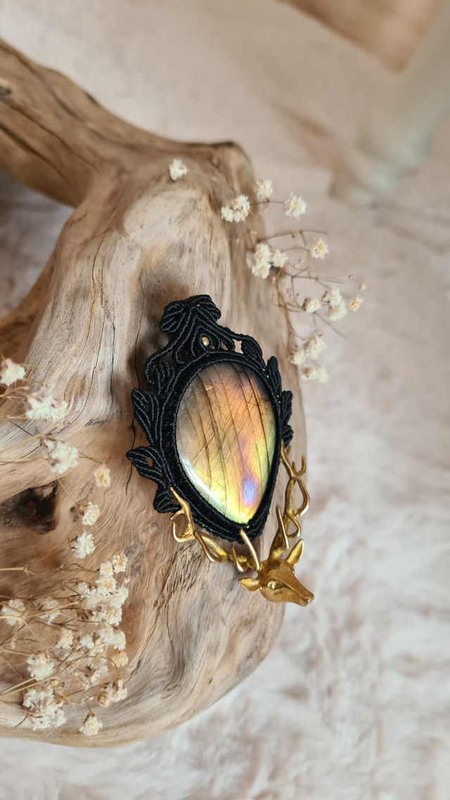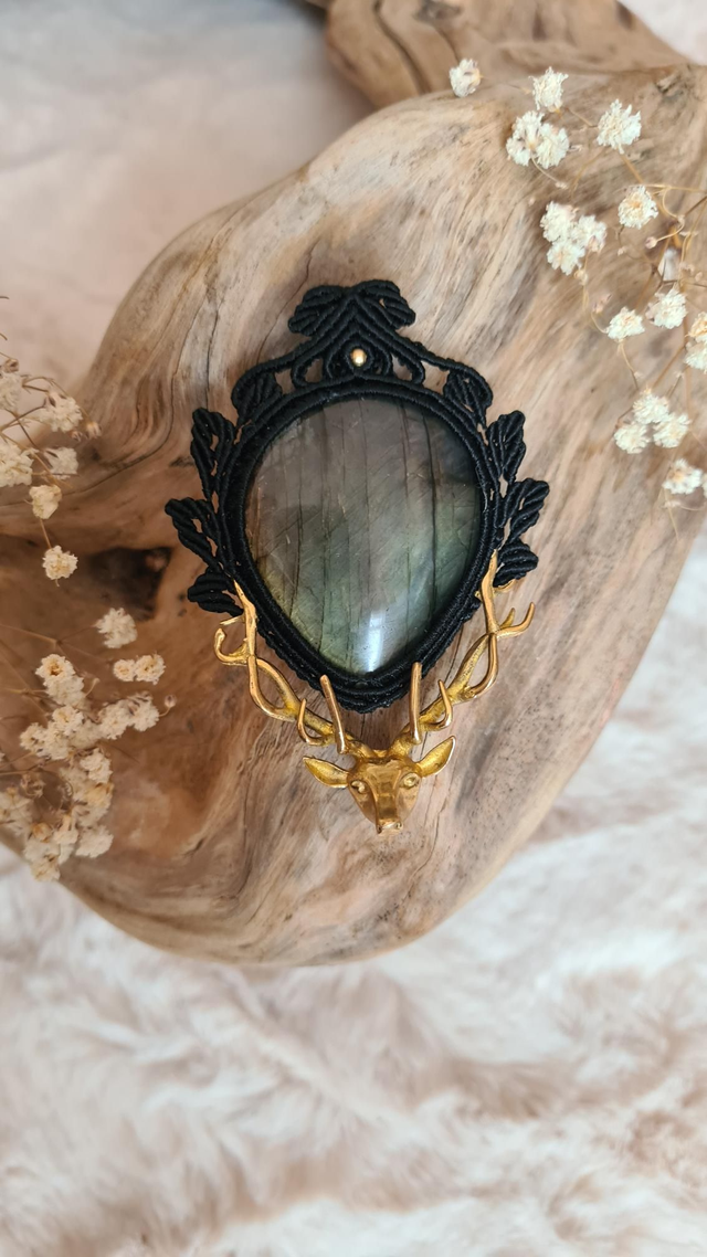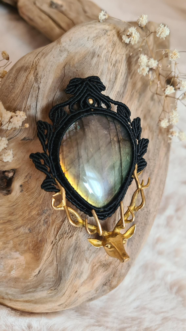 Ce collier unique, fait à la main en micromacramé noir, enlace une labradorite aux reflets mystiques, sertie de formes de feuilles comme un talisman végétal.