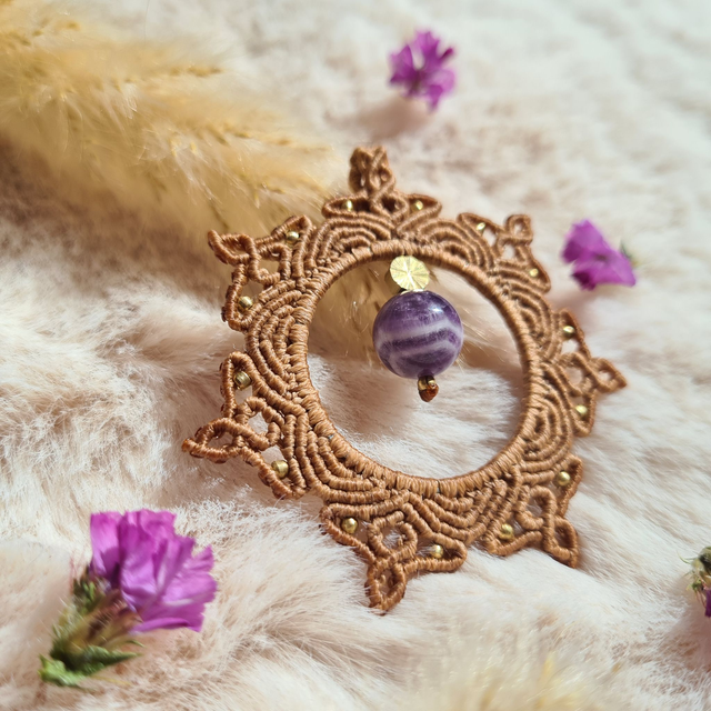 Magnifique pendentif mandala en micro macramé, finement tissé à la main.. Ce bijou unique est orné d'une pierre naturelle qui ajoute une touche puissante à votre tenue.