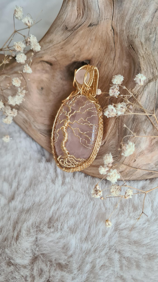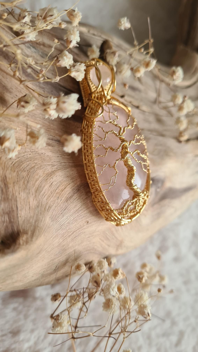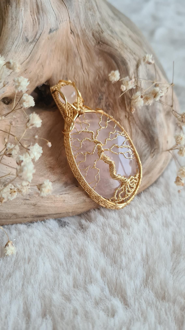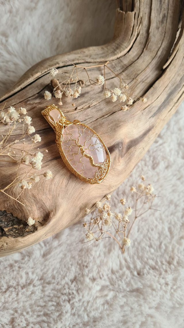 Le quartz rose est traditionnellement associé à la douceur, à l’apaisement émotionnel et à l’ouverture du cœur. L’arbre de vie renforce cette symbolique en évoquant la croissance, la protection et le lien entre le monde visible et invisible.