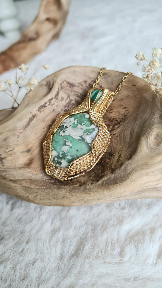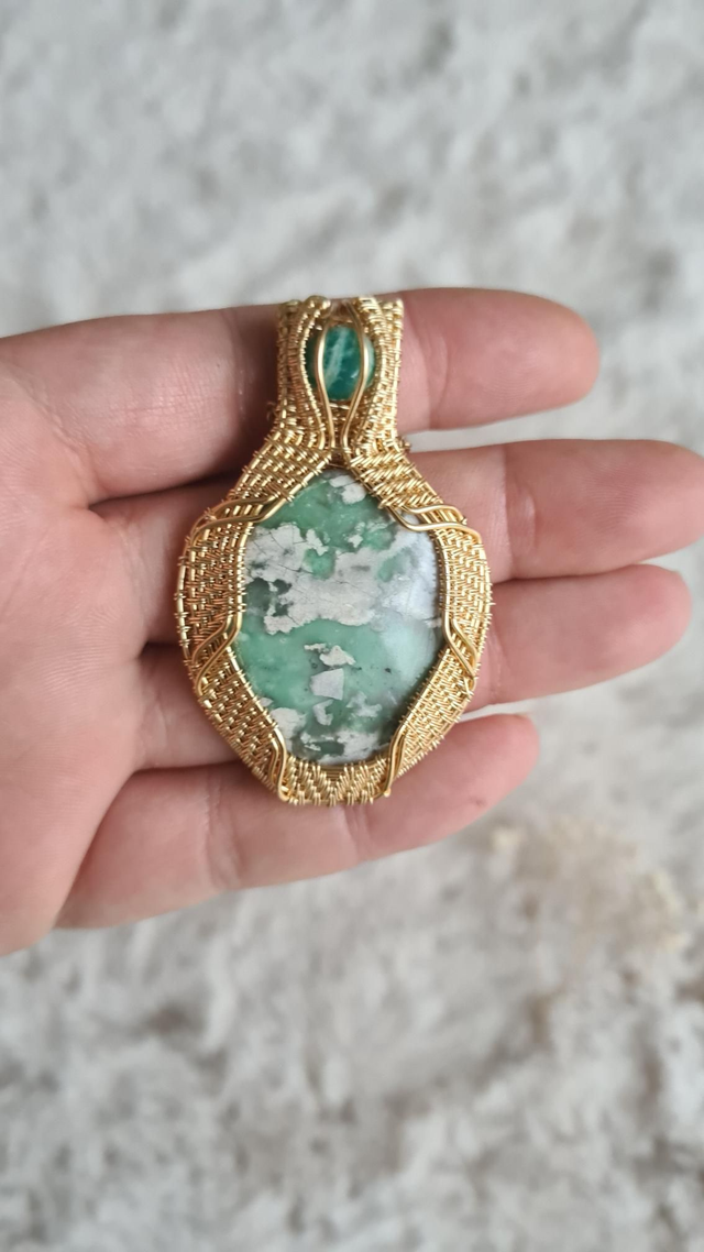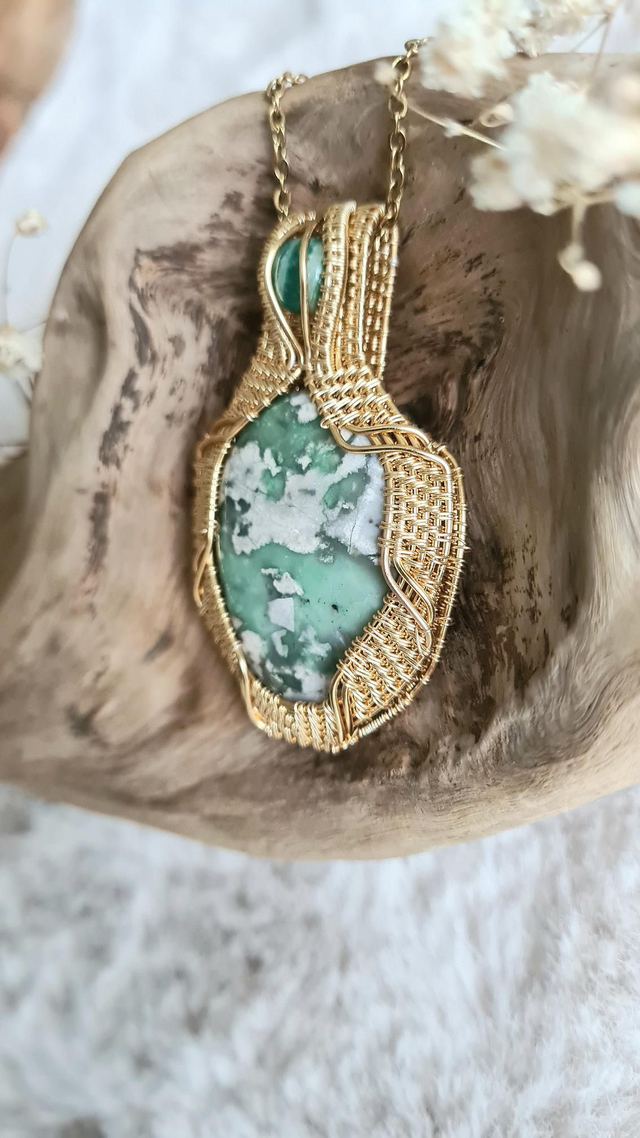 Ce pendentif doré avec une variscite et une amazonite est un bijou artisanal, réalisé selon la technique du wire wrapping. Chaque pièce est façonnée avec patience, en enroulant délicatement du fil de cuivre galvanisé doré, traité anti-ternissement, afin de créer une monture élégante qui met en valeur la pierre.